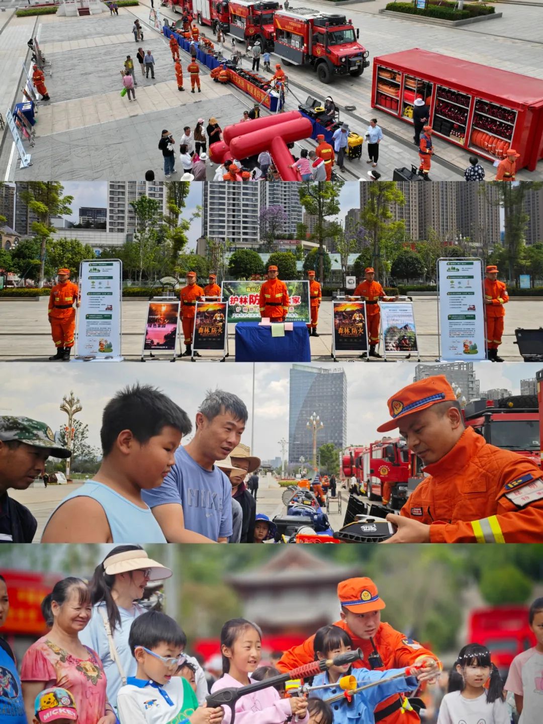 在安宁市人民广场,特勤大队组织开展装备展示和防火宣传。指战员们结合当前任务形势特点,通过悬挂宣传条幅标语、设置消防安全提示牌、免费发放消防知识宣传单、消防装备展示和灭火装备体验等方式,为驻地群众宣传森林防火的重要性和防火期内林区用火注意事项,正确教育引导群众防灾减灾的社会责任与安全意识。同时组成车队在城市主干道和环城路线机动巡回,沿途播放防火法律法规和常识。