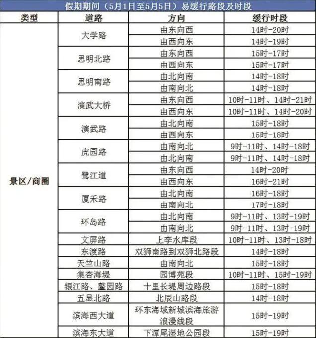 假期期间(5月1日至5月5日)每日10时至19时将是游客出行高峰时段,热门景区和商圈周边道路将会有较大的客流和车流。特别是环岛路厦大白城至龙虎山路段和大学路演武路路口,地铁占道施工导致道路交通组织变更,车辆通行效率降低,容易引起车辆长时间缓行。
