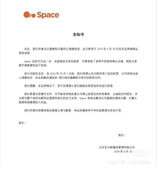 根据Space公告,“尽管采取了多种手段依然难以为继……经公司股东决定,自2024年6月1日起,我们将停止史贝斯所有门店的经营,公司将依法进入清算状态……”曾经获明星吴彦祖投资的团课天花板Space为何突然“闭店”?