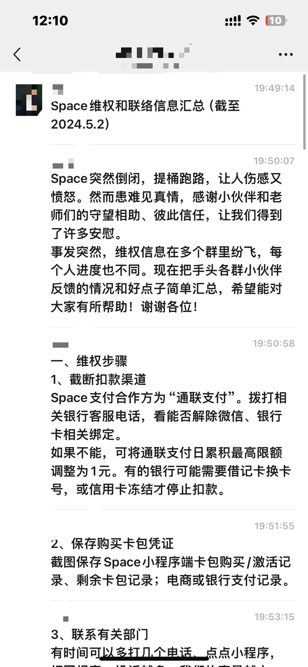 据蓝鲸记者了解,目前Space维权群已经有多个满员,涉及会员人数超过2000人。不少会员在群内分享维权步骤和Space短期替代选择。目前群内置顶的信息是详细的维权步骤,其中包括“截断扣款渠道”,“保存购买卡包凭证”“填写会员损失统计表”等非常详细。