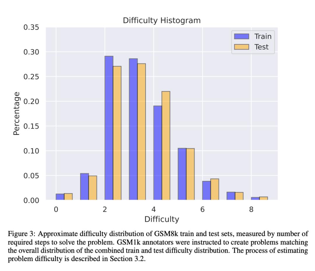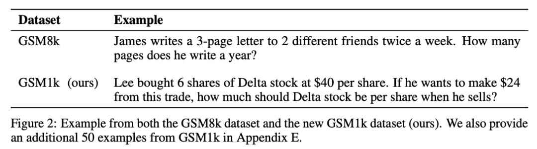 GSM1k 内包含 1250 道小学数学题。这些问题只需基本的数学推理即可解决。Scale AI 向每位人工注释者展示 3 个 GSM8k 的样本问题,并要求他们提出难度相似的新问题,得到了 GSM1k 数据集。研究者们要求人工注释者们不使用任何高级数学概念,只能使用基本算术(加法、减法、乘法和除法)来出题。与 GSM8k 一样,所有题的解都是正整数。在构建 GSM1k 数据集的过程中,也没有使用任何语言模型。