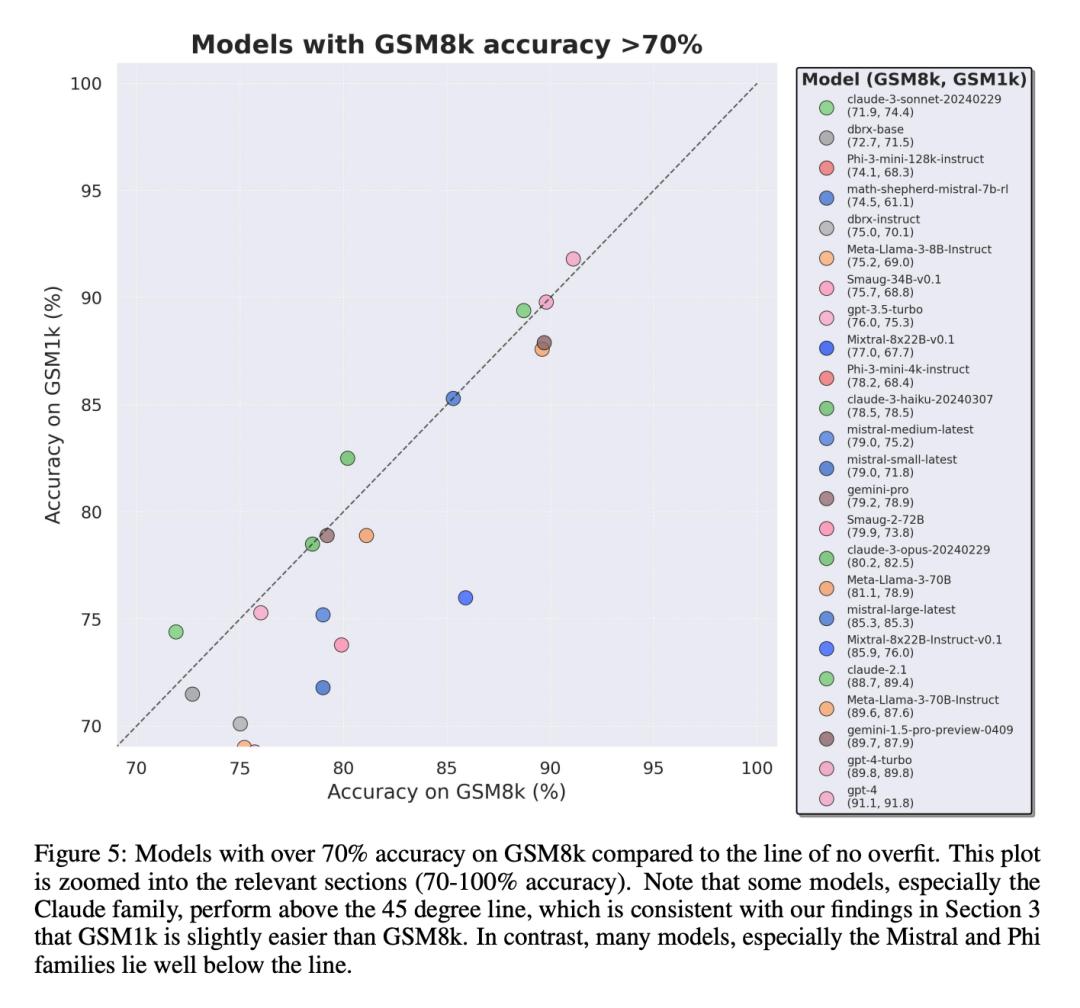 尤其是以量小质优闻名的 Mistral 和 Phi 模型系列,根据 GSM1k 的测试结果显示,几乎其中的所有版本都显示出了过拟合的一致证据。