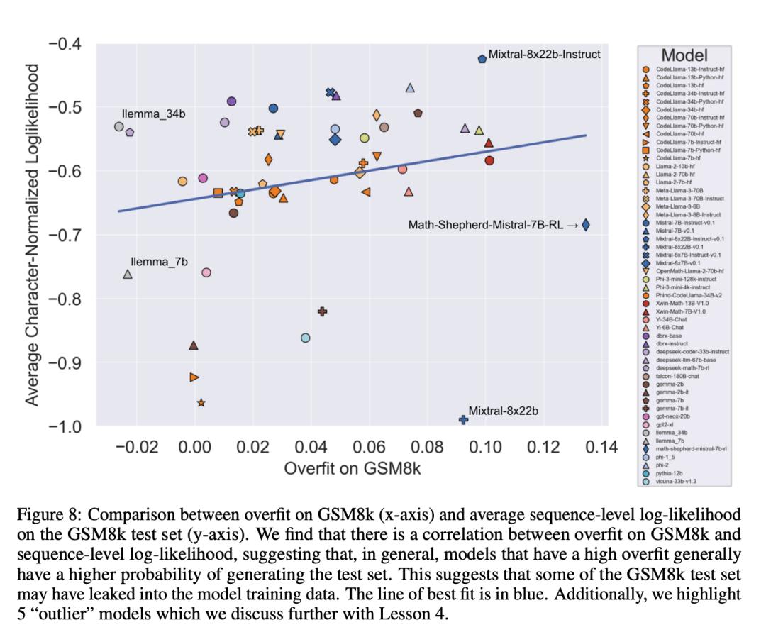 研究者表示,数据污染可能并不是全部原因。他们通过几个异常值观察到了这一点。仔细研究这些异常值可以发现,每个字符对数似然值最低的模型(Mixtral-8x22b)和每个字符对数似然值最高的模型(Mixtral-8x22b-Instruct)不仅是同一模型的变体,而且具有相似的过拟合程度。更有趣的是,过拟合程度最高的模型(Math-Shepherd-Mistral-7B-RL (Yu et al. [2023]))的每个字符对数似然值相对较低(Math Shepherd 使用合成数据在流程级数据上训练奖励模型)。因此,研究者假设奖励建模过程可能泄露了有关 GSM8k 的正确推理链的信息,即使这些问题本身从未出现在数据集中。最后他们发现, Llema 模型具有高对数似然和最小过拟合。由于这些模型是开源的,其训练数据也是已知的,因此正如 Llema 论文中所述,训练语料库中出现了几个 GSM8k 问题实例。不过,作者发现这几个实例并没有导致严重的过拟合。这些异常值的存在表明,GSM8k 上的过拟合并非纯粹是由于数据污染造成的,而可能是通过其他间接方式造成的,例如模型构建者收集了与基准性质相似的数据作为训练数据,或者根据基准上的表现选择最终模型检查点,即使模型本身可能在训练的任何时候都没有看到过 GSM8k 数据集。反之亦然:少量的数据污染并不一定会导致过拟合。