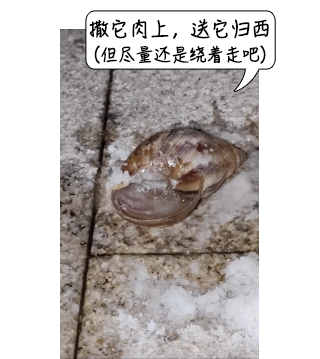 2、如果无法消杀,遇到这种大蜗牛尽量绕道而行。蜗牛喜欢阴凉潮湿,雨过天晴,气温升高,它们就自己躲起来了。