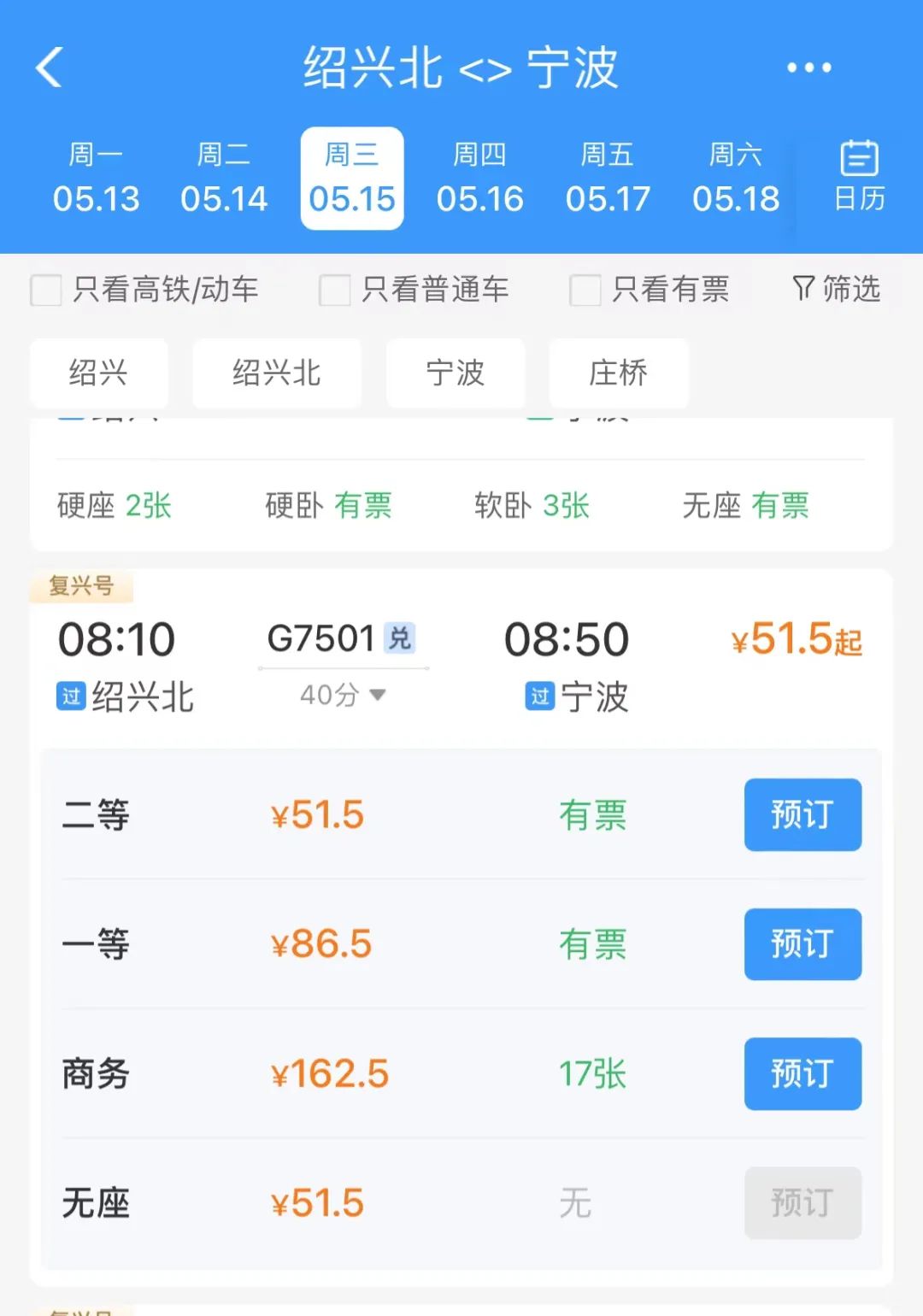目前,绍兴北站到宁波站高铁(G字头列车)二等座公布票价为51.5元,一等座为86.5元,商务座为162.5元,优化调整后,公布票价调整为二等座62元,一等座99元,商务座216元。