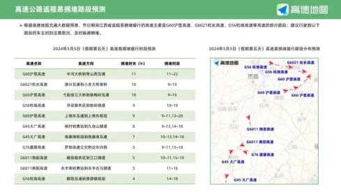 1、高速公路出入口、客运站、高铁站5月5日返程时易发生拥堵;