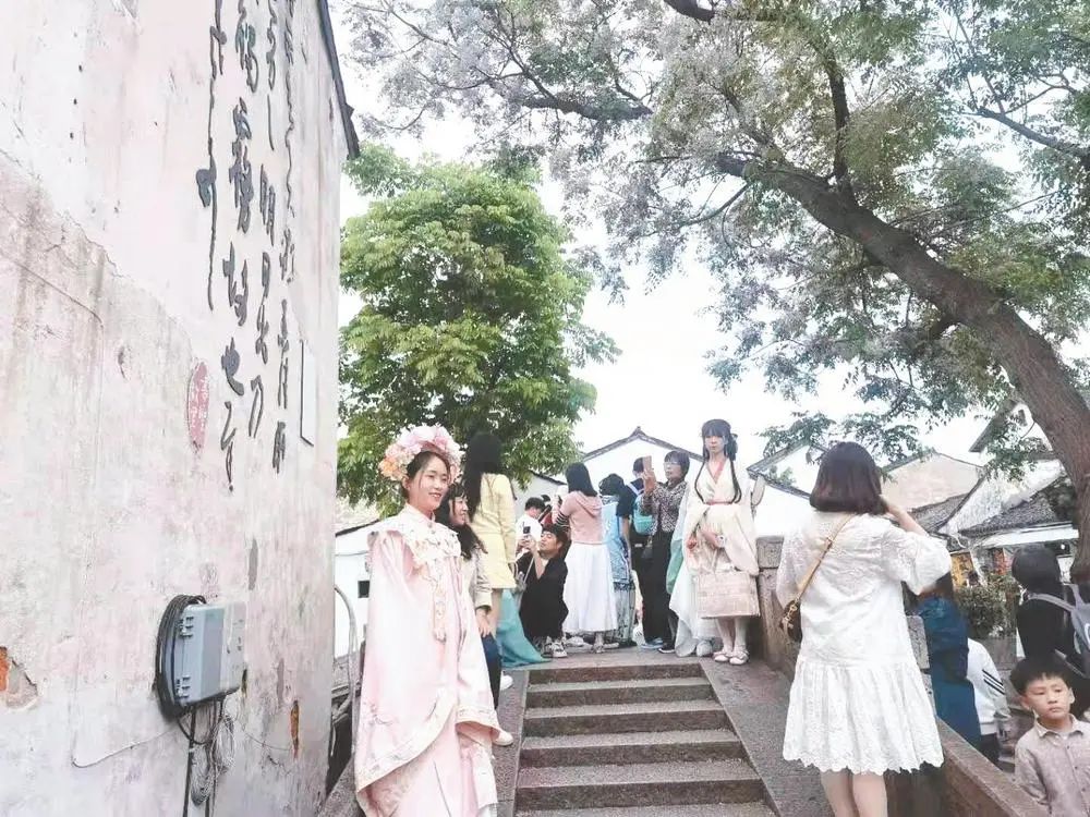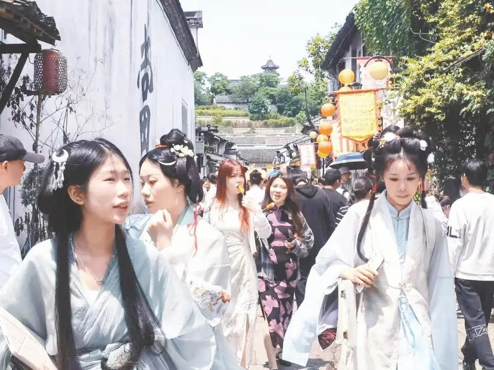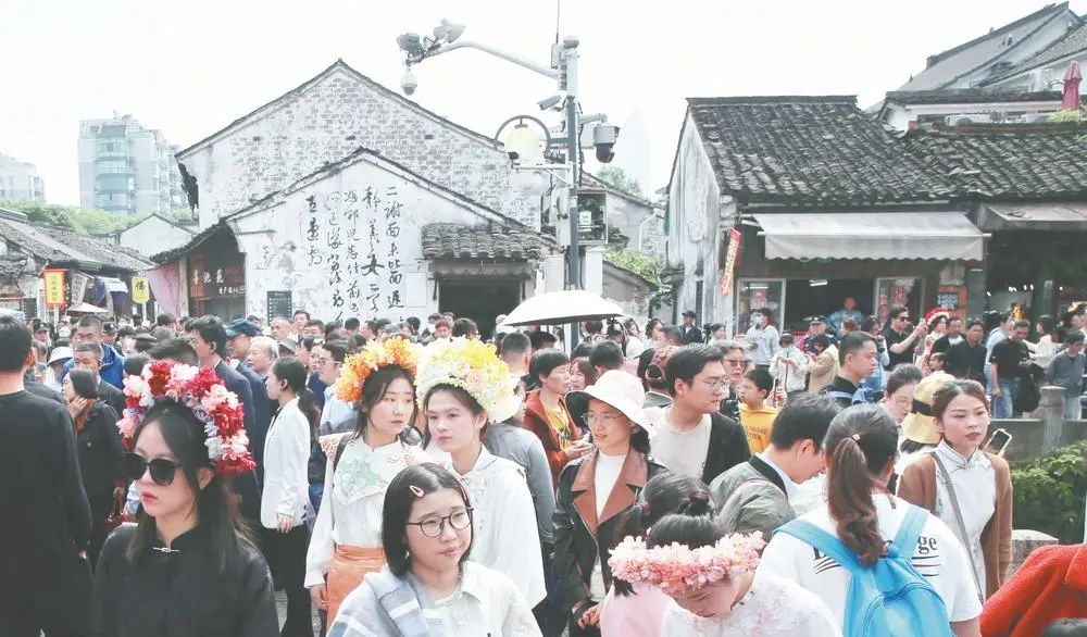 5月2日,书圣故里人气火爆。(记者 梁永锋 摄)“五一”假期,书圣故里人头攒动,游人如织。身着汉服、头戴簪花、手拿团扇的女子,成群结队,漫步街巷,拍照留影,成为书圣故里一道独特的风景。古色古香的书圣故里,“文化香”“水乡韵”“烟火气”醉倒了五湖四海客,更受到来自全国各地年轻游客的追捧。