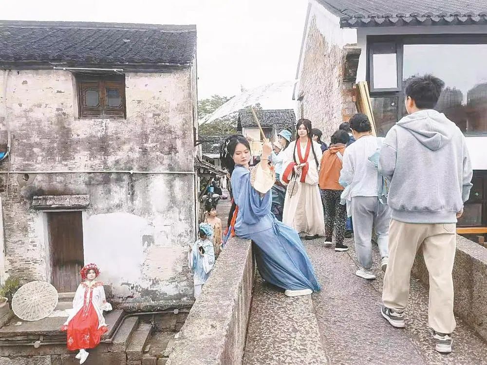 老街随处可见穿古装的年轻人一拨一拨的摄影师领着一队队身着汉服的女子在墨池、古桥边、河沿旁拍照。成群结队身穿汉服的女子还在小摊边吃臭豆腐、尝萝卜丝饼。