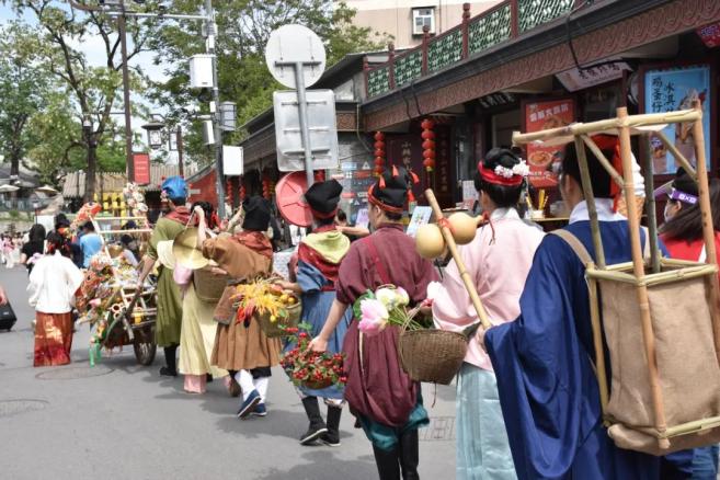 国风市集、汉服走秀、历史复原小剧场、古风运动会、国风音乐会、非遗技艺体验……京城著名的“千年古道、百年老街”模式口历史文化街区等地乘着“国潮风”,举办了精彩纷呈的文化活动,为市民、游客的假日文旅体验添彩。“快来看一看喽,新鲜的辣椒和大蒜”“父老乡亲们,买点儿后山刚摘的大樱桃,不甜不要钱”“卖鲜花啦,买一朵花儿送给娘子”……在此起彼伏的吆喝声中,模式口用宋代《货郎图》所描绘的情景,为游客展开了一幅鲜活的古代生活画卷。