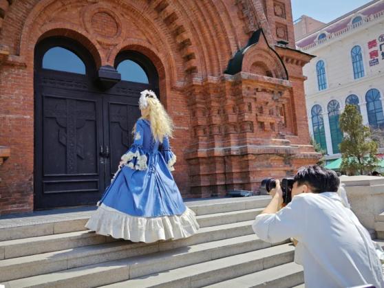 拜占庭风格的圣·索菲亚教堂是哈尔滨的标志性建筑,也是“俄罗斯公主”旅拍打卡地。5月1日上午,记者看到,仅教堂门口就同时有四组大小公主们在拍照。