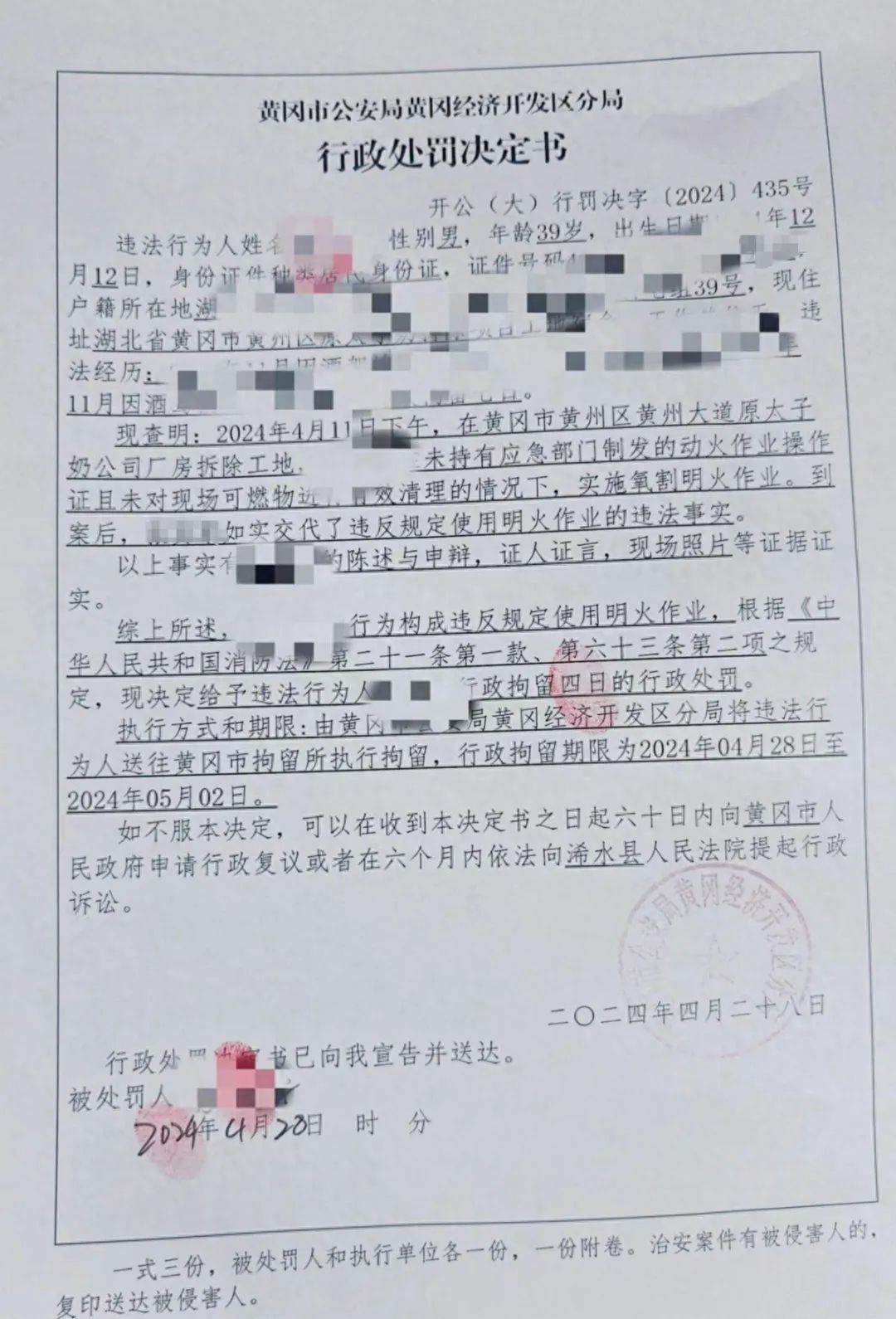 经核查,该工人明知自己未持有动火行业操作证仍在工地实施氧割动火作业,且未有效清理现场可燃物,存在严重的火灾风险。查明情况后,大队依法将相关证据移送给黄冈市公安局开发区分局办理。4月28日,办案机关依据《中华人民共和国消防法》第二十一条第一款、第六十三条第二项之规定,对该当事人处以行政拘留4日处罚。