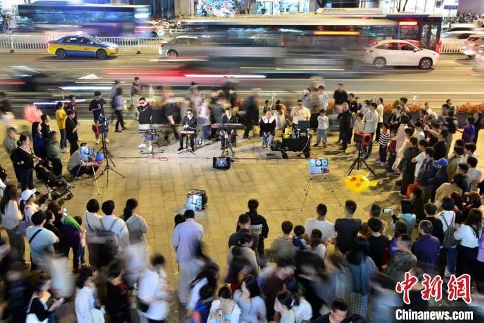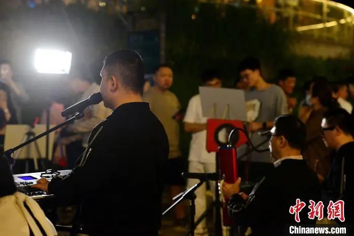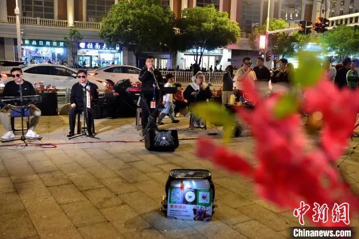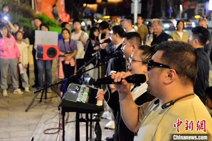 图为福建省海峡残疾人艺术团“看到”组合在福州青年会广场户外演出,吸引了许多市民和游客驻足聆听。中新网记者 张斌 摄5月3日晚,“看到”组合成员在演唱歌曲。当日,一支来自各行各业,平日里是盲人按摩师、企业职员、钢琴调律师、音乐人,完全由视障人士组成的福州本地音乐团体乐队——福建省海峡残疾人艺术团“看到”组合在福州青年会广场户外演出,吸引了许多市民和游客驻足聆听。据了解,该组合曾获得首届盲人歌手大赛金奖、第八届全国残疾人艺术汇演金奖、第十届全国残疾人艺术汇演(东部片区)一等奖等多个奖项。