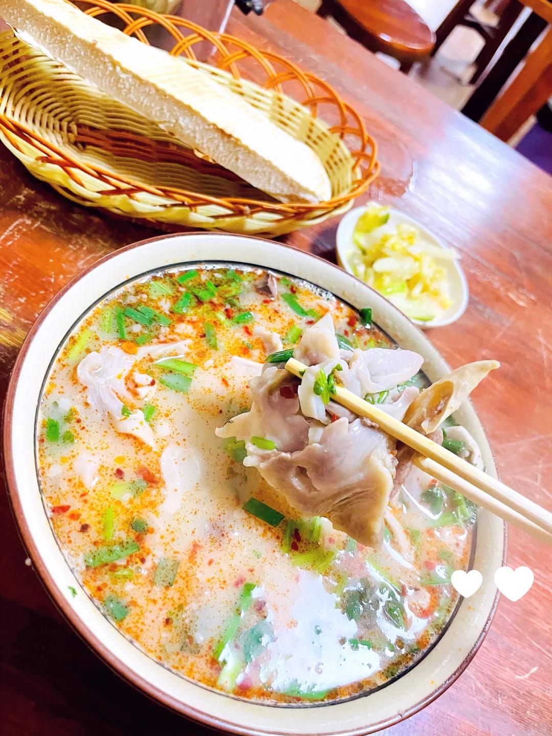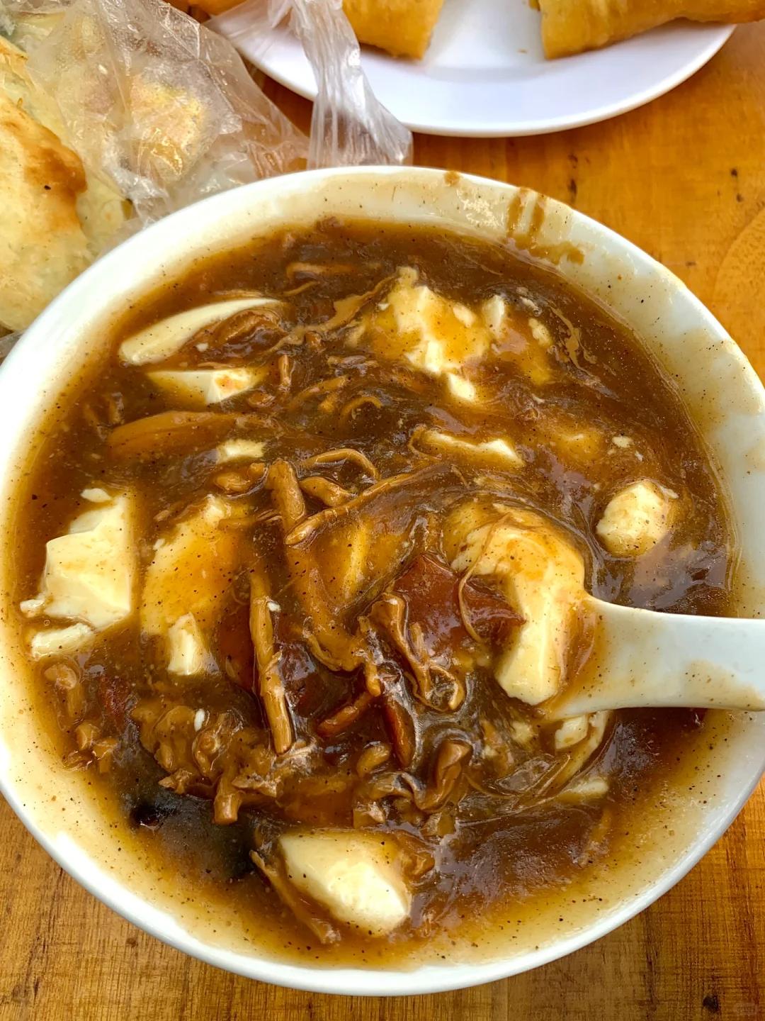 开封还有肉胡辣汤掺豆腐,豆腐滑嫩嫩的,配菜浸润在浓汤中,胡椒热辣狂放与肉交织,真的超级过瘾。