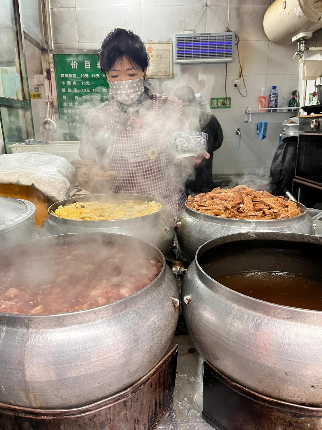 经营四味菜的店家一般门口要支起五口锅,其中四口煨着“四味”,还有一口锅中是沸腾的羊汤。