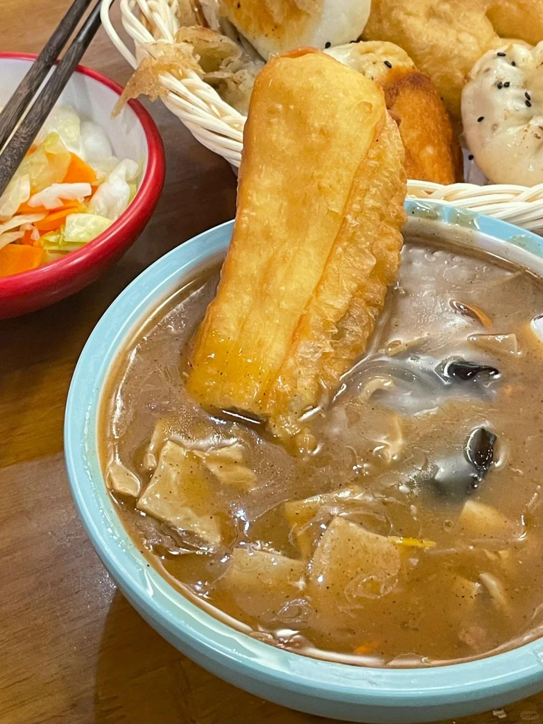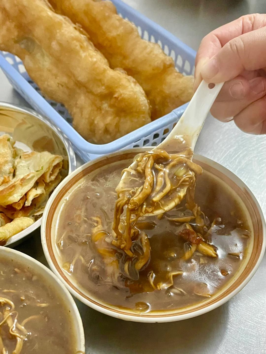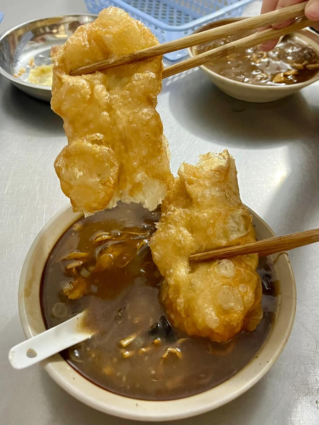 再配上一份刚刚出炉的,热乎乎的油条,放入胡辣汤里,吸饱了汤汁,一口脆生生,一口黏糊糊,香麻了。