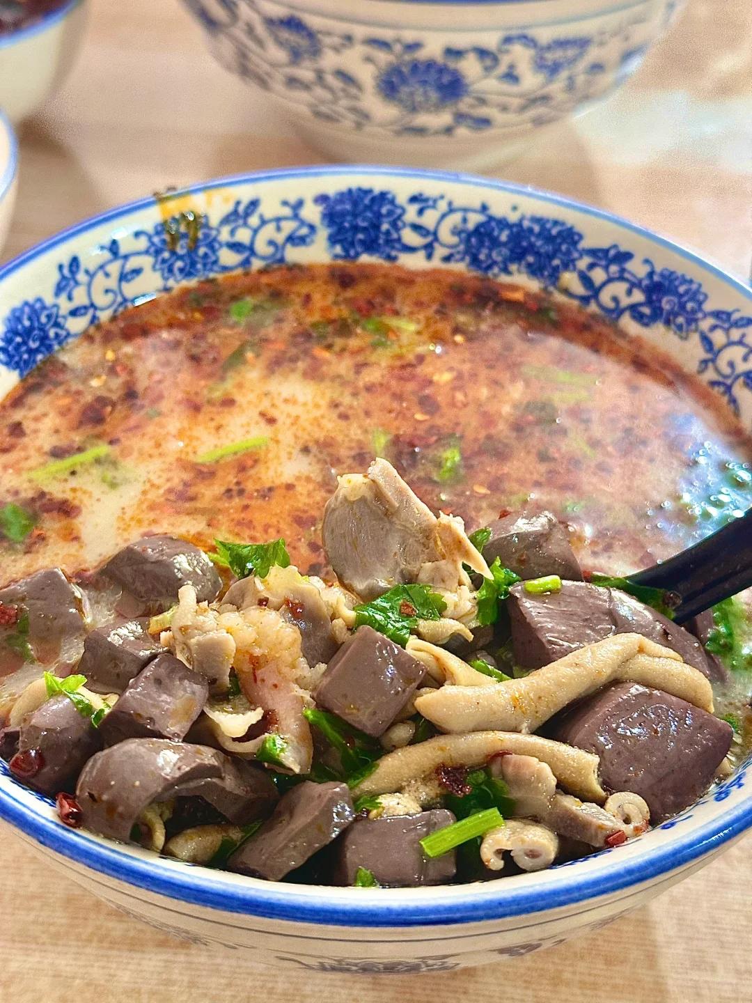 / 鸡血汤 /开封重口味的汤并不只有羊双肠汤一个,还有鸡血汤。做法一般是采用整鸡炖煮熬汤,将鸡血、鸡肠、鸡心、鸡肝、鸡肉酥肉等各种食材备好。