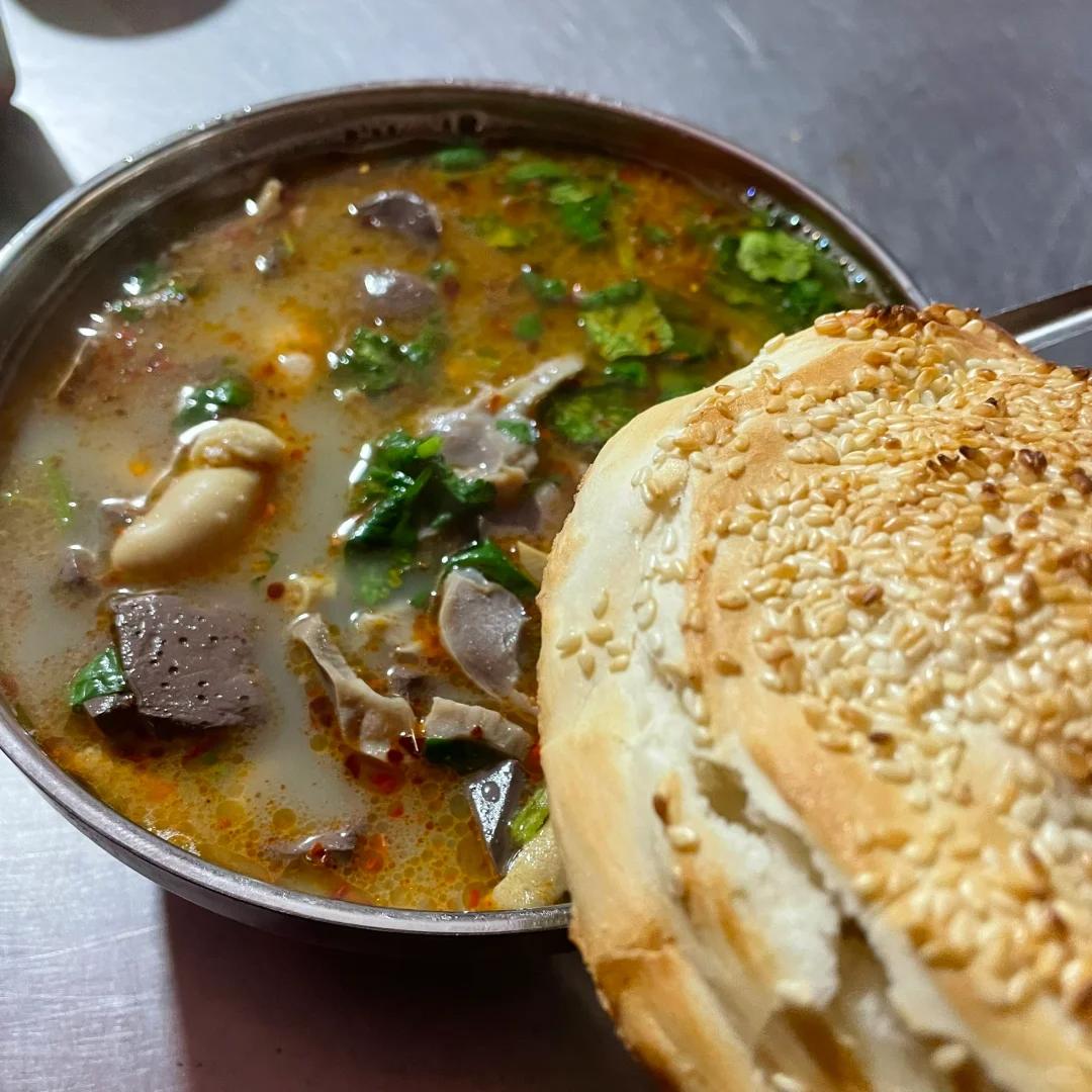 调好后,再拿过一块刚出炉的锅盔,这可是羊肉汤的绝配,掰成小块放入汤中,就可以开吃。