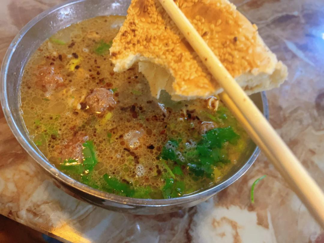 吃着吃着再泡几块烧饼,吸满汤汁的烧饼既有软软口感,又有烧饼的焦香味,一口汤,一口饼,舒坦。