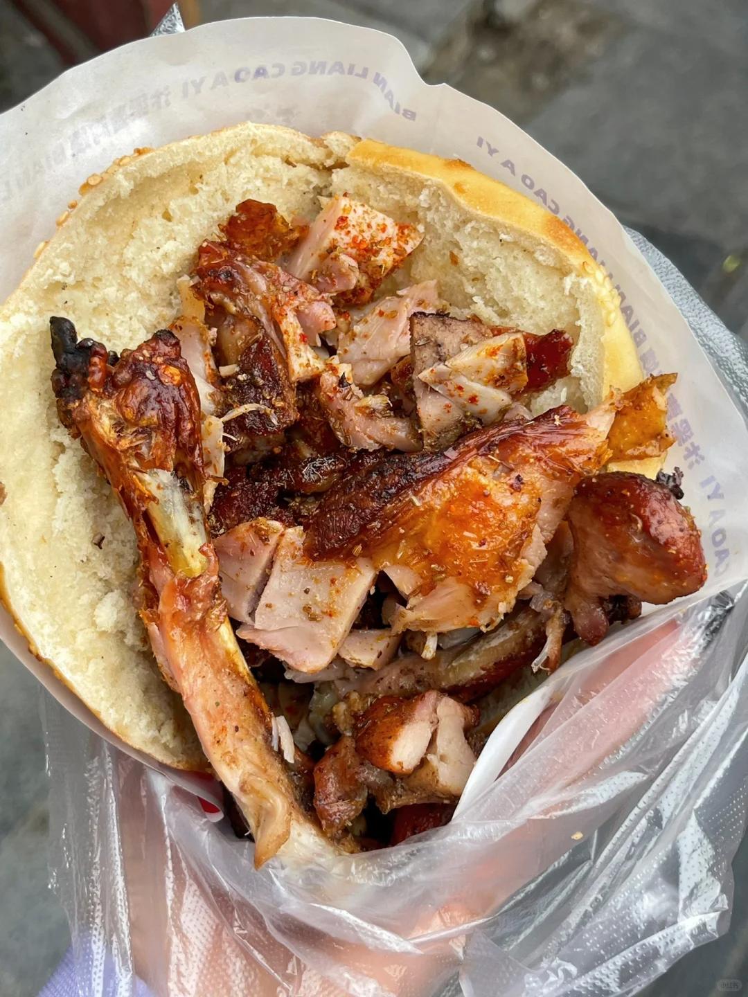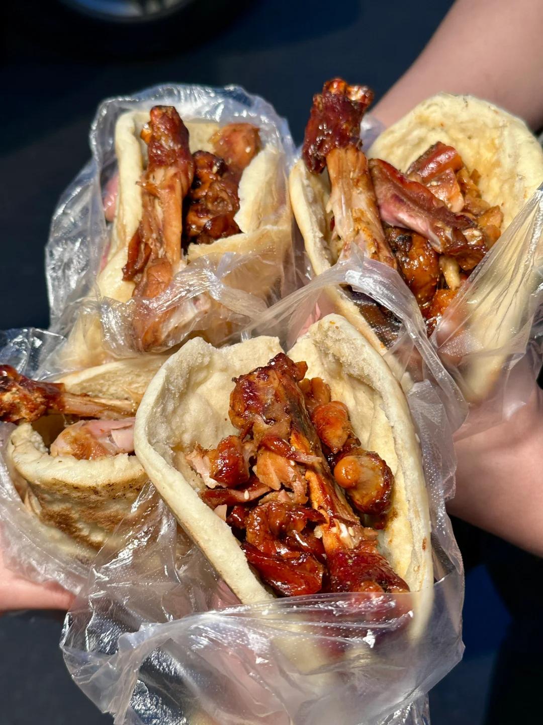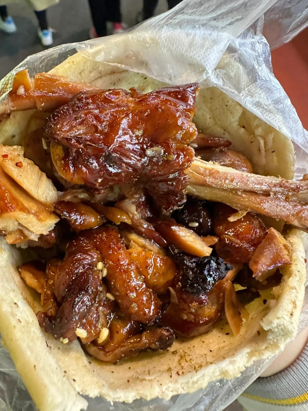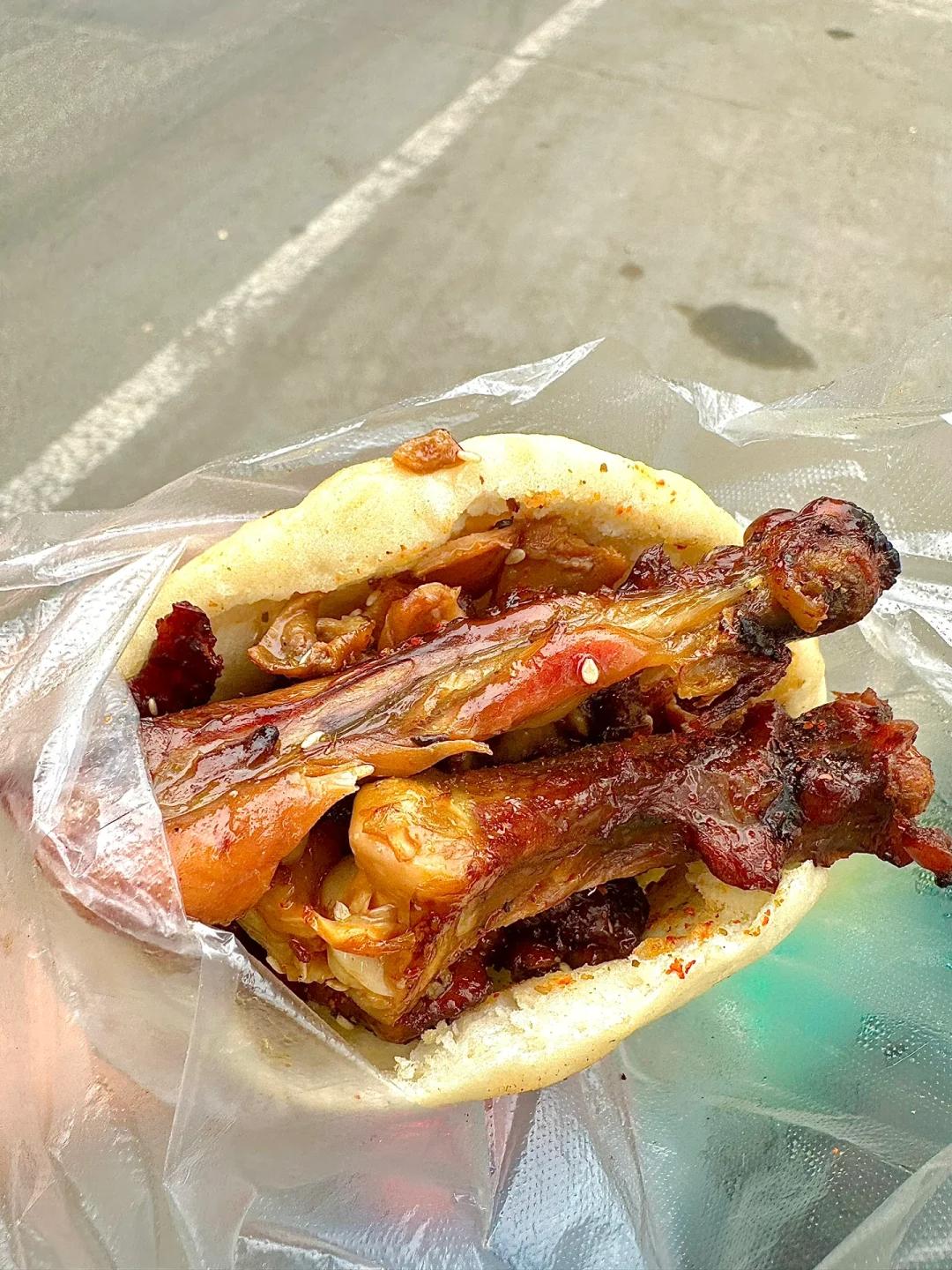 / 烧饼夹鸡腿 /必吃的就是烧饼夹鸡腿,被誉为中国版的汉堡包,一口咬下去,特别满足~