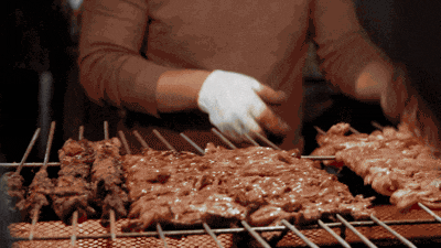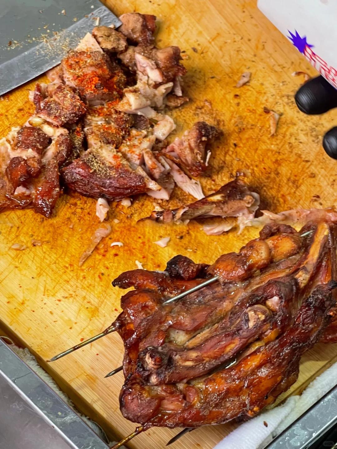 只见这个店家从焖炉中拿出冒着热气的鸡腿,三下五除二将鸡肉剔下,再撒上孜然、辣椒和秘制调料。
