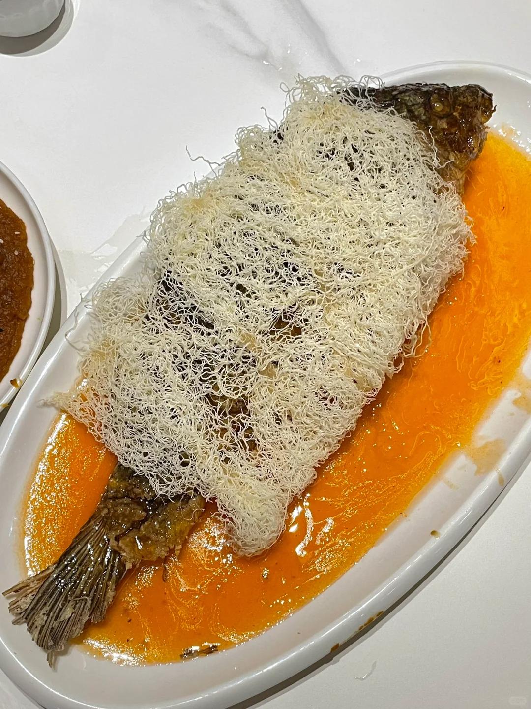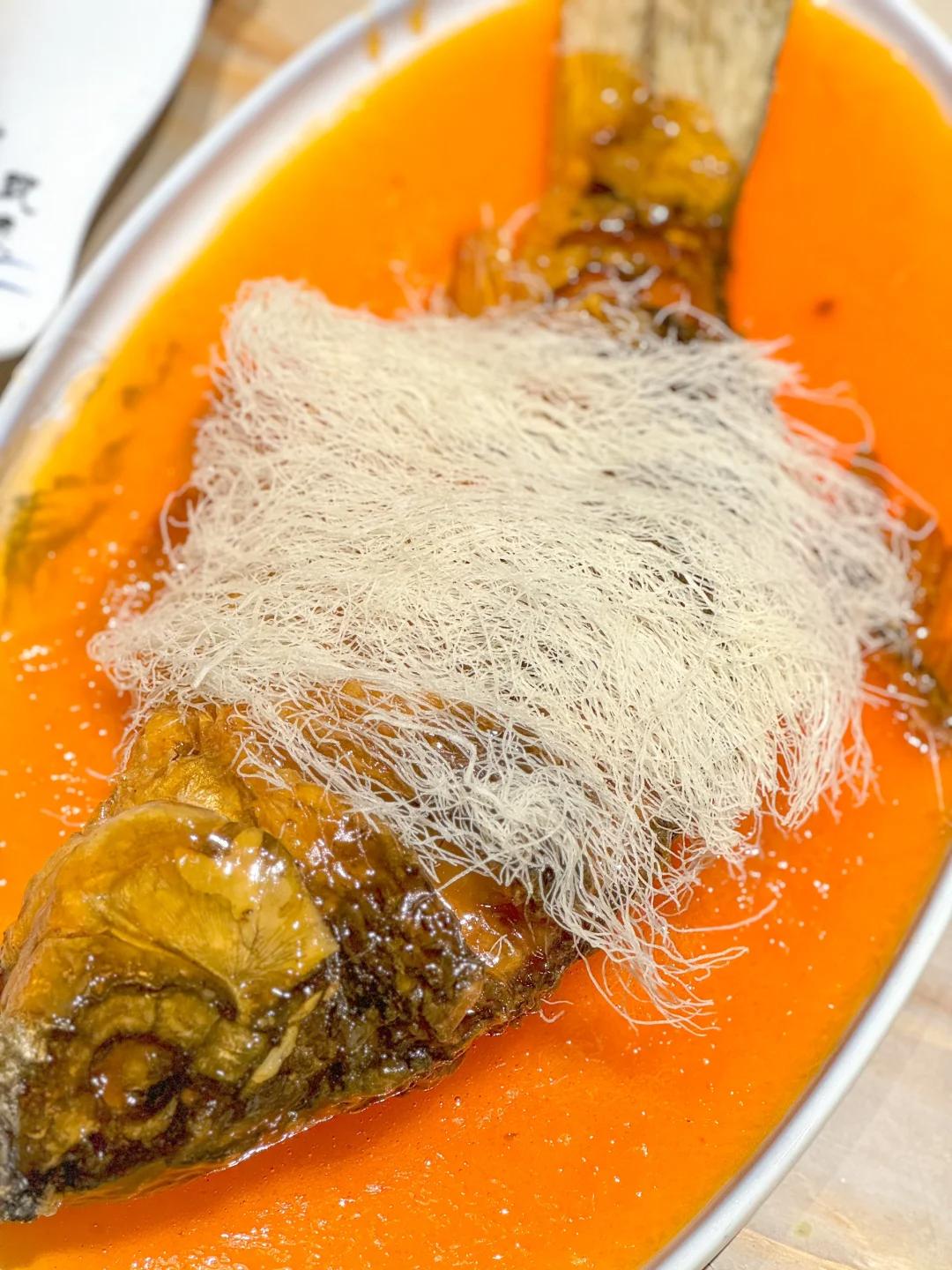 / 鲤鱼焙面 /鲤鱼焙面,由"糖醋熘鱼"和"焙龙须面"两道名菜配制而成。其特点是色泽枣红,软嫩鲜香;焙面细如发丝,蓬松酥脆。