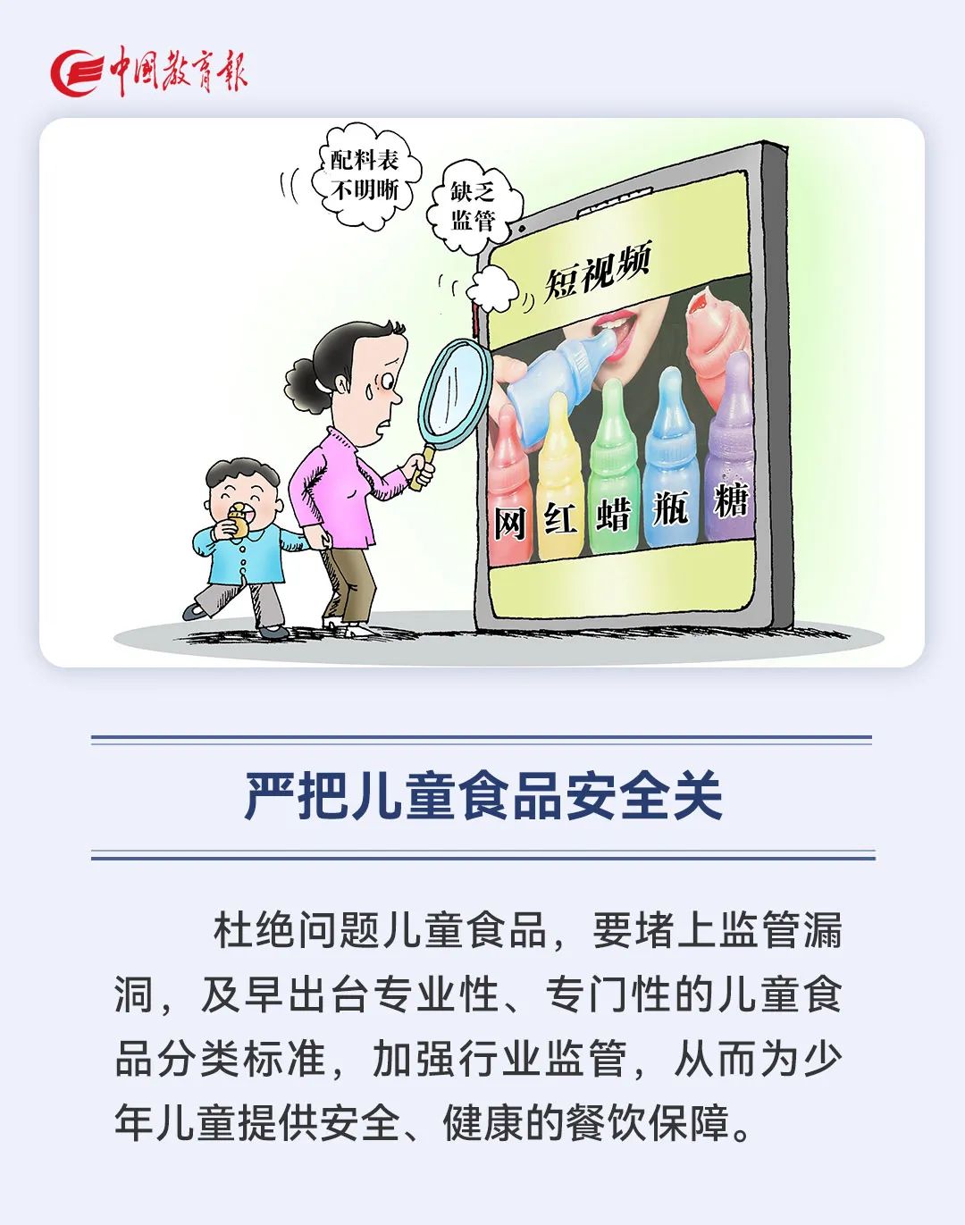杜绝问题儿童食品,要堵上监管漏洞,及早出台专业性、专门性的儿童食品分类标准,加强行业监管,从而为少年儿童提供安全、健康的餐饮保障。