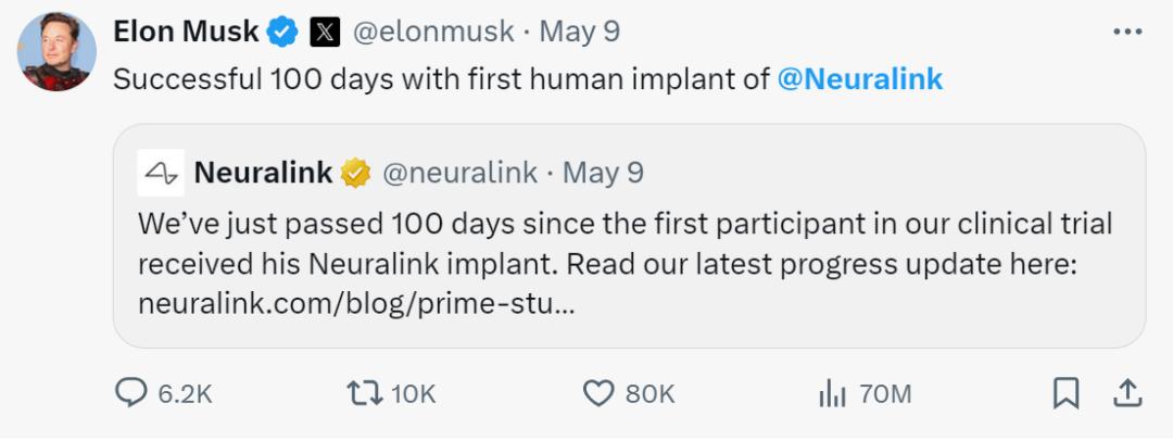 尽管如此,也不耽误马斯克庆祝 Neuralink 第一次人体植入成功 100 天。