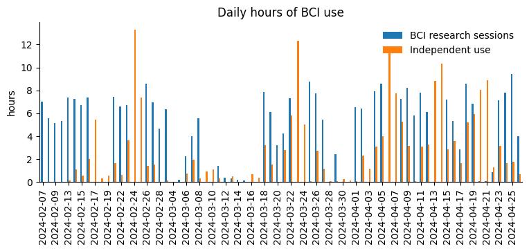 工作日,Arbaugh 使用脑机接口的时间是 8 个小时,周末会超过 10 个小时。最近一次,他在一周内总共使用该设备 69 个小时:35 个小时用于结构化会话,另外还有 34 个小时用于个人使用。