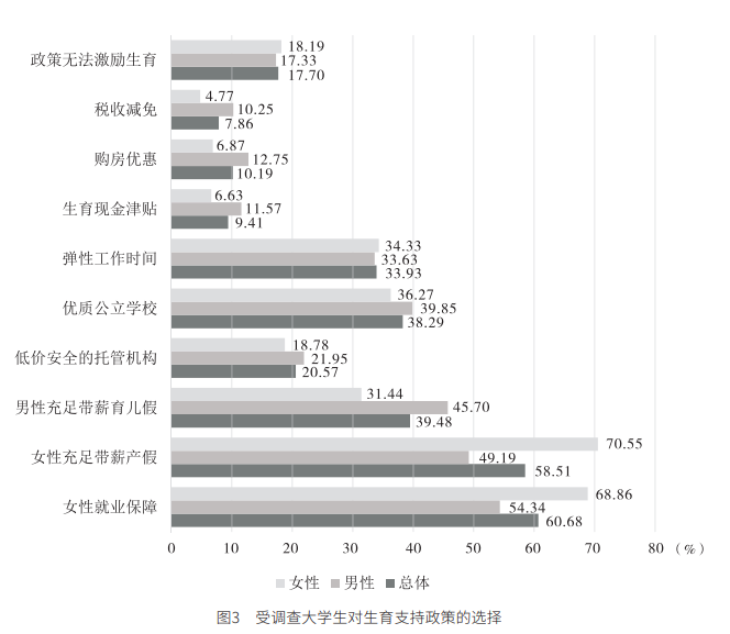 具体而言,三孩政策对大学生生育意愿影响有限,超过四成大学生(41.99%)表示不会因政策改变生育意愿,因为政策出台而增强生育意愿的仅有8.26%,近四成(38.68%)表示对三孩政策不清楚,说明政策宣传还需要加强。在受访大学生对生育支持政策选择中,保障女性就业公平(60.68%),女性充足的带薪产假(58.51%)是增强生育意愿最受关注的条件,远高出其他政策,其次是男性充足育儿假(39.48%)、优质公立学校教育资源(38.29%)和弹性工作时间(33.93%);有20.57%认为低价安全的托育机构可以增强生育意愿。而经济支持政策激励效果并不看好;税收减免、购房优惠、生育现金津贴等政策对大学生增强生育意愿的效应都相当微弱,比例仅分别为7.86%、10.19%、9.41%;还有17.7%的人表示无论给什么政策都不会增强自己的生育意愿。