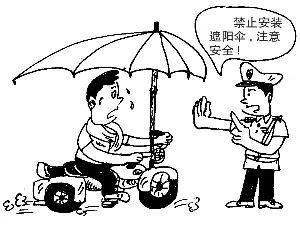 骑车莫用遮阳设备骑自行车、电动自行车时,一手撑伞,一手握车把的情形在夏季街头并不少见。如此操作易使车辆失衡而发生事故。此外,还有部分电动自行车会在车上加装遮阳棚等设备,存在极大的安全隐患,车体面积被扩大就增加碰擦事故率,增大驾车人盲区,影响车辆转弯灵活性,不利于驾车人快速避险,增加了伤亡概率等。