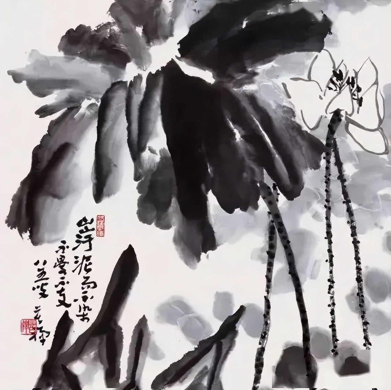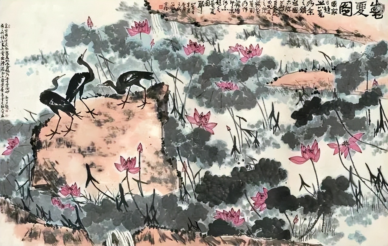 《盛夏图》纵368厘米,横580厘米,荷,石,水,鸟,组成了庞大画景。这不仅是他平生最大篇幅巨作,也是中国大写意花鸟画史上首件最大篇幅巨作。