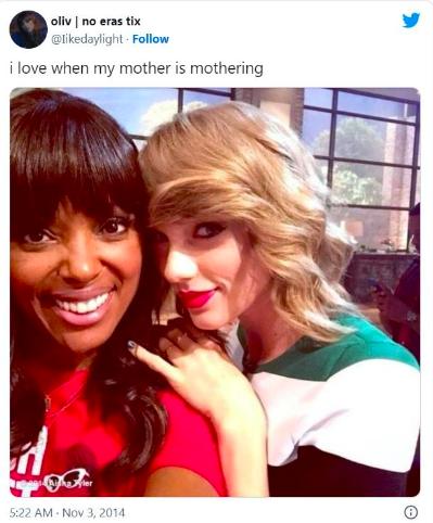 据不完全考据,互联网上的第一声妈,可能来自一位外国网友。2014年,一位泰勒·斯威夫特的粉丝@Iikedaylight,用自己的X账号发布了一张斯威夫特和演员爱莎·泰勒的自拍,并将这张照片配上文案“I love when my mother is mothering.”成为网络梗“mother is mothering”(母亲正散播母爱)的起源。