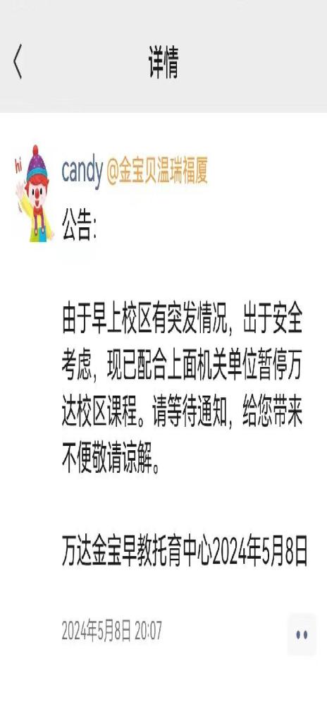 同时记者在邝光宇的登记关联信息中,发现还有一家位于福州的蔚尔育尔教育咨询有限公司,经营门店为金宝贝福州仓山欢乐颂店,而该店在5月8日同样发布了暂停授课的公告。