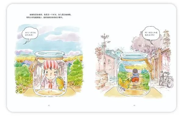 尽管《老街的童话》从头到尾充满了欢笑,但仔细想想,两位主人公的生活其实也蛮不容易的。他俩相依为命,其他的家人不知何故都缺席了。鱼儿看上去像是小学中高年级学生,因为腿脚残障,需要拄着拐杖勉强行走,出门得坐在手推车上,或是爷爷骑的三轮车上;爷爷是一位退休的邮递员,生活简单朴素,肥肥胖胖,腰还有老毛病。爷爷一直悉心照料着鱼儿,还总想着法子满足孩子的愿望。书中没有回避鱼儿在现实中遭遇的一些窘状:被游泳培训中心拒收,被练游泳的孩子们嘲笑,为了保护一只蝴蝶而被几个熊孩子欺负——严格来说,那已构成了霸凌。但作者处理得相当自然平和,鱼儿并不因自己被欺负而伤心,却会为蝴蝶受伤而难过,而男孩豆包的见义勇为行为也带着几分孩童之间的泼皮耍诈。想想看,现实的确有相当严峻的一面,但不妨碍人们保持温情和善良,以幽默感与好奇心感受生命中的快乐和神奇。