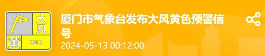 厦门市气象台2024年05月13日00时12分发布大风黄色预警信号:受冷空气影响,预计未来12小时我市及沿海风力将逐渐增强,厦门内海及各大桥东北风最大可达5—6级、阵风7—8级;厦门沿海、高海拔山区最大可达6—7级、阵风8级;崇武到东山沿海最大可达6—7级、阵风8—9级。请注意防范。从昨晚到今晨