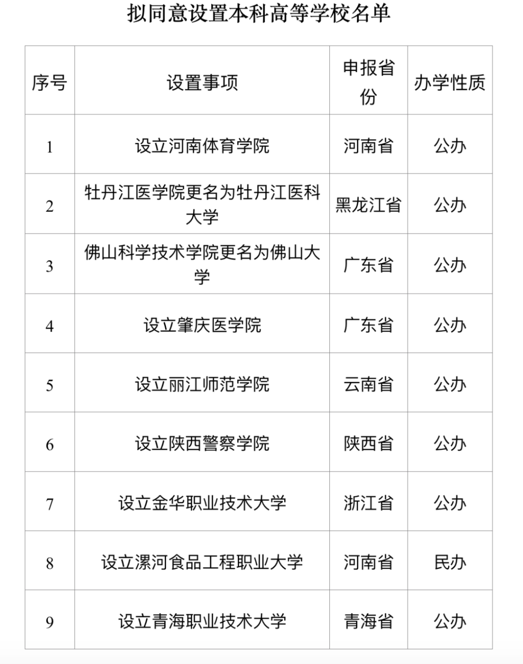 日前,教育部发布《关于拟同意设置本科高等学校的公示》,涉及河南、黑龙江、广东、云南、陕西、浙江、青海共7省的9所高校。