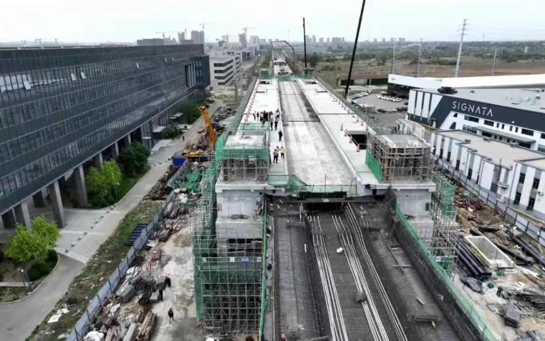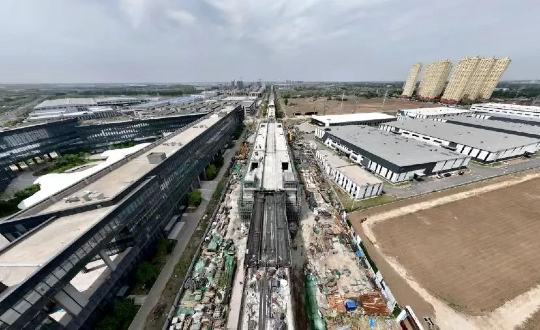记者在现场看到,高架桥梁宛如长龙在城市间穿行而过,通过无人机从天空俯瞰,蔚为壮观。中德大街高架车站的雏形已显现,两侧是站台,中间留出铺轨的空间。作业现场,各种机械设备发出阵阵轰鸣,施工人员正在高架段上紧张忙碌。