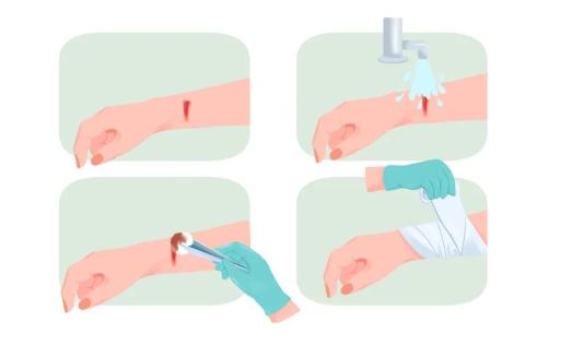 ◆ 伤口持续出血,要用干净毛巾或消毒纱布覆盖伤处,压迫10~20分钟止血,之后用绷带加压包扎,视情况去医院处理。