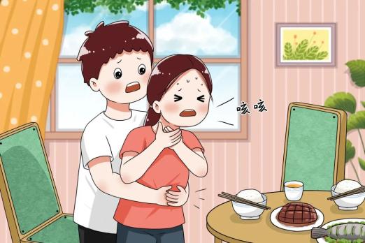 ◆ 若发现有人用手抓住自己的喉咙,却不能说话时,说明异物可能已经堵住了呼吸道,应立即采取哈姆立克急救法:施救者站在被救人身后,以拳头的大拇指和食指侧对准被救者的上腹部,另一手握紧该拳头,使劲快速向上方挤压,急救时要控制力度。