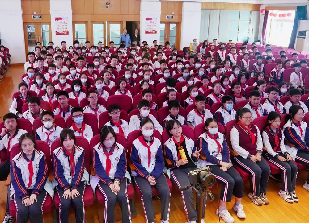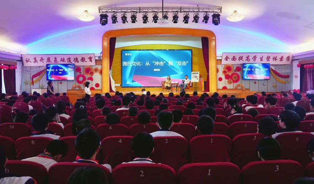 ▲讲座现场(供图:刘文)当天,各年级学生代表齐聚学校大礼堂,与主讲嘉宾面对面,聆听他们的讲述和分享。同时,各班级也于所在教室观看讲座视频直播。