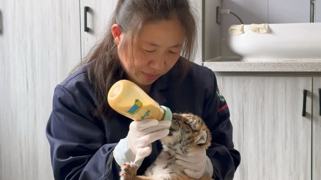 饲养员给小东北虎喂食横道河子东北虎林园是世界上最大的东北虎繁育基地,此次5只小东北虎的诞生,不仅为园区增添了新的成员,也为东北虎的繁育保护工作作出了贡献。