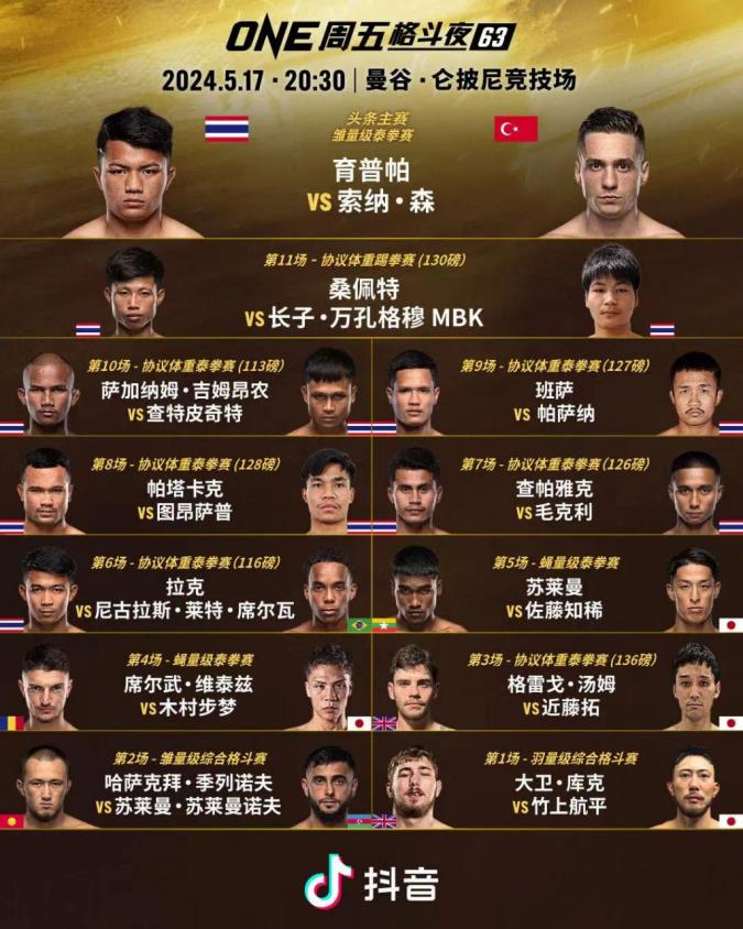 5月17日晚20:30,由国际大型体育赛事IP-ONE冠军赛举办的ONE周五格斗夜大型格斗赛事将于曼谷仑披尼经济场举办。当晚比赛共有12场赛事,其中包括两场综合格斗赛和十场泰拳赛。