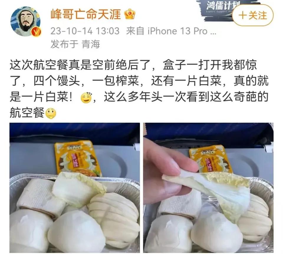 去年10月有个知名热搜,网友在微博发了自己飞机餐的照片,配文:“四个馒头,一包榨菜,还有一片白菜,真的就是一片白菜!这么多年头一次看到这么奇葩的航空餐。”此事一出,引发了网友不少共鸣。