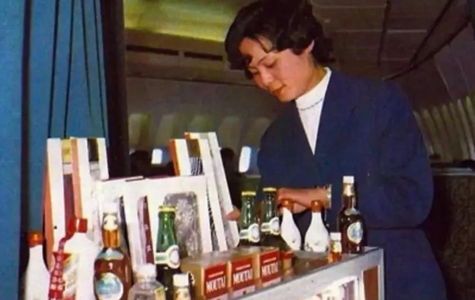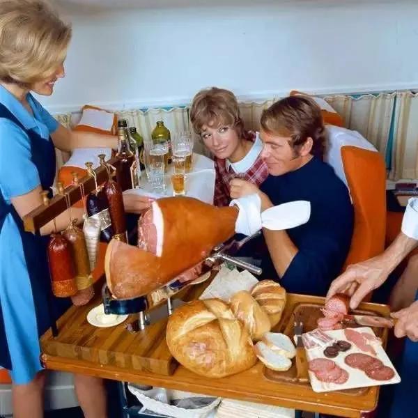 六七十年代左右,飞机餐开始越来越隆重。国外的头等舱不但有鲜切火腿、大龙虾、鱼子酱,还配着红酒喝和香槟,连餐具都是银质的;国内也是不甘落后,飞机餐里配着茅台酒、中华烟,还有大白兔奶糖提供。