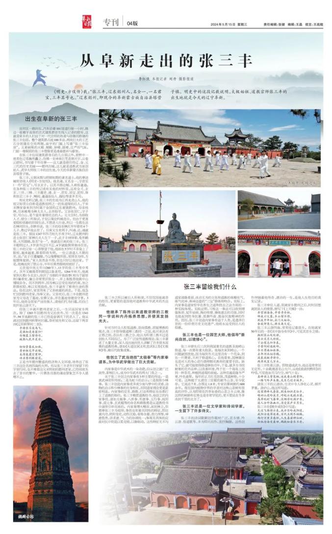 《明史·方伎传》载:“张三丰,辽东懿州人,名全一,一名君宝,三丰其号也。”辽东懿州,即现今的阜新蒙古族自治县塔营子镇。明史中的这段记载说明,太极始祖、道教宗师张三丰的出生地就是今天的辽宁阜新。