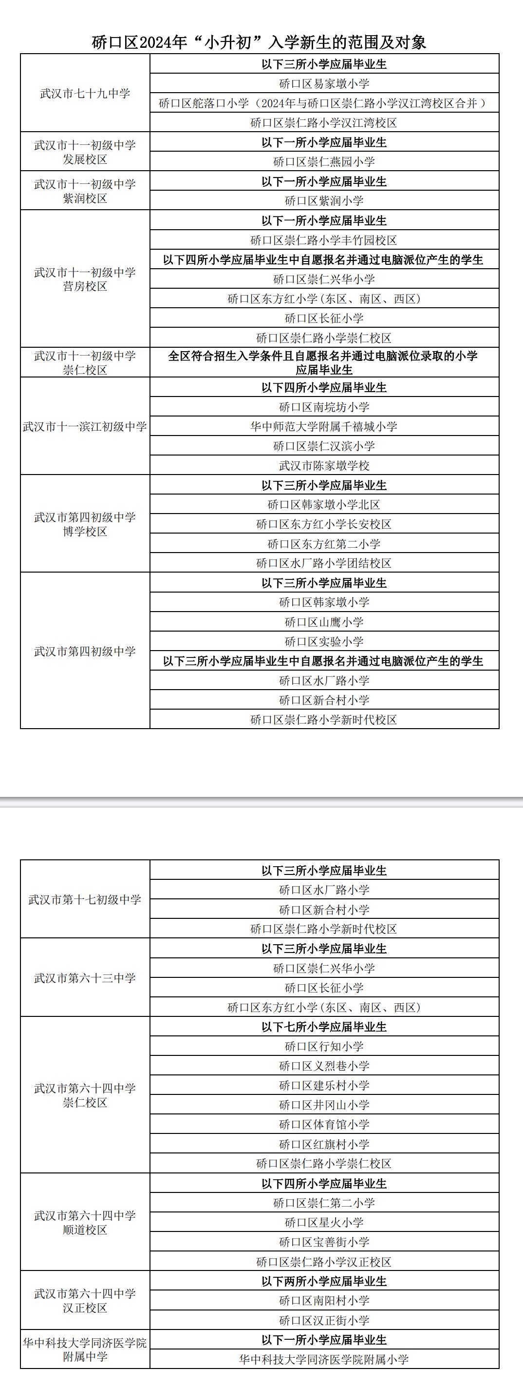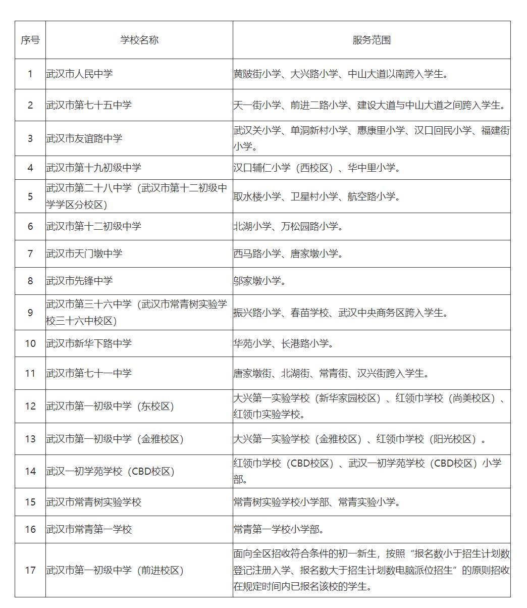 备注:因武汉市第一初级中学(前进校区)校园维修改造,该校区初一年级新生将搬迁至武汉一初学苑学校(南校区)办学(江汉区民族路166号)。汉阳区