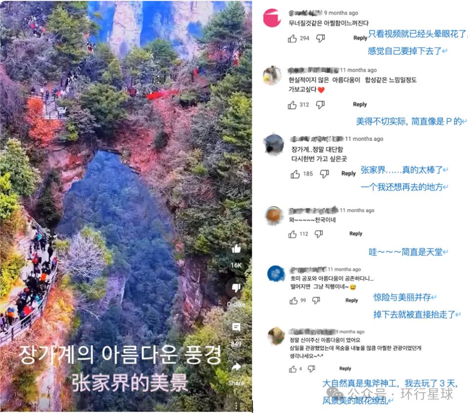 一个韩国up主在张家界旅游时录制vlog,底下有网友也提到了中国的韩语标识。