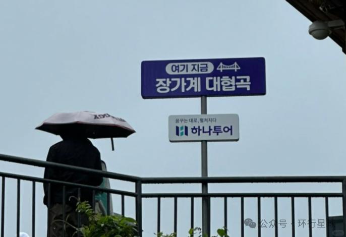 韩国旅游公司也不忘在中国张家界用韩文给自己打广告,上面写着“这里是张家界大峡谷——韩亚旅游”。图:小红书@DiskderandGun