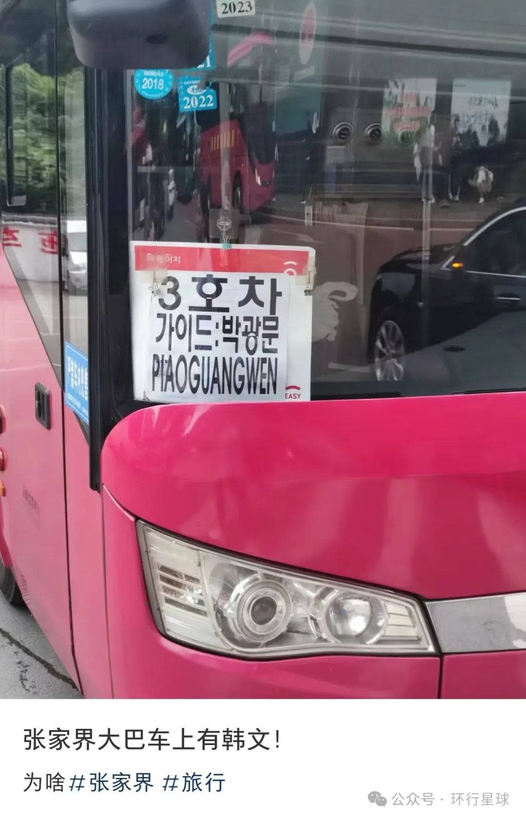 还有网友在张家界偶遇了标有韩语的大巴车,估计是韩国旅行社包的车。