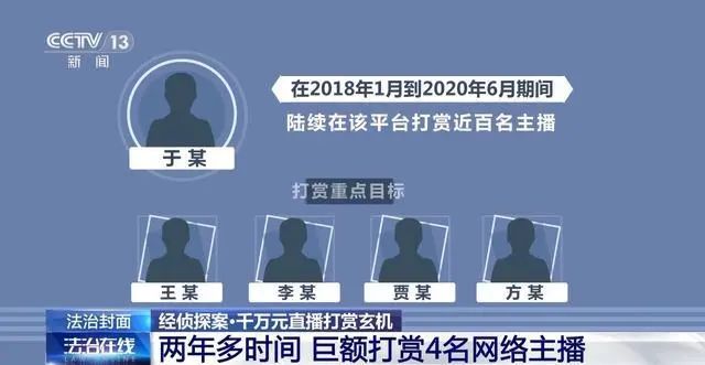 警方调取了于某在直播平台的个人账户,从他过往的打赏记录里发现,于某在2018年1月到2020年6月期间,陆续在该平台打赏了近百名主播,其中,王某、李某、贾某、方某这四名主播是他打赏的重点目标。